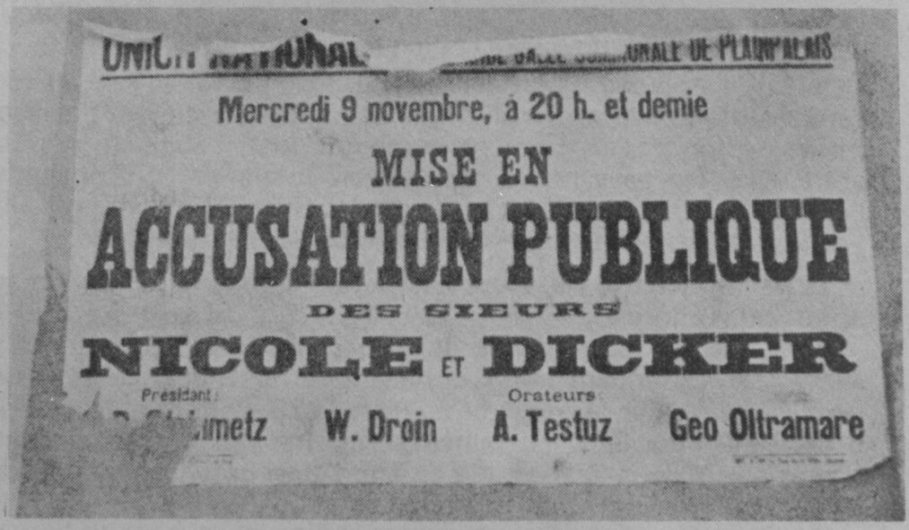 Début novembre 1932, l’Union nationale dirigée par Georges Oltramare (1896-1960) cherche à capitaliser sur le récent échec de l’initiative fiscale du Parti socialiste. Elle décide de s’attaquer à deux de ses principaux dirigeants, Léon Nicole et Jacques Dicker, en annonçant par voie d’affiche leur « mise en accusation publique », le 9 novembre à la Salle communale de Plainpalais.