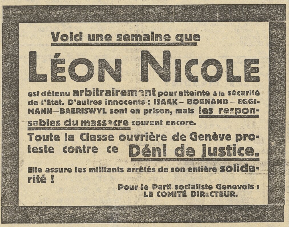Léon Nicole est maintenu au secret jusqu’au 1er décembre. Ses soutiens réclameront sa libération en arguant de son immunité parlementaire, ce qui sera refusé par le Conseil national. Atteint de tuberculose osseuse et craignant pour sa santé, il finira par obtenir, sous la menace d’une grève de la faim, de pouvoir aller se soigner à Leysin dès le 3 janvier 1933. Il devra attendre le 4 mars pour être formellement mis en liberté provisoire.
