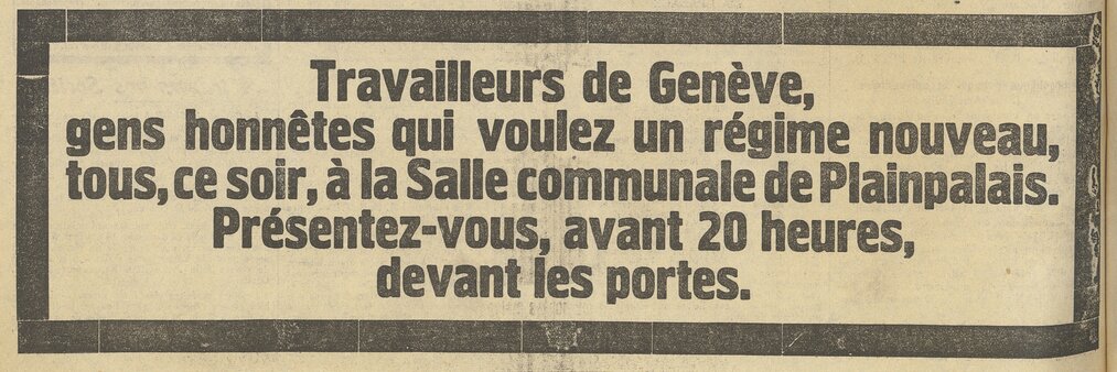 Plusieurs milliers de manifestant·e·s se rassemblent aux abords de la Salle communale, le long de la rue de Carouge et de ses abords. Le socialiste Léon Nicole, l’anarchiste Lucien Tronchet (1902-1982) et le communiste Francis Lebet (1897-1955) prononcent des discours enflammés.