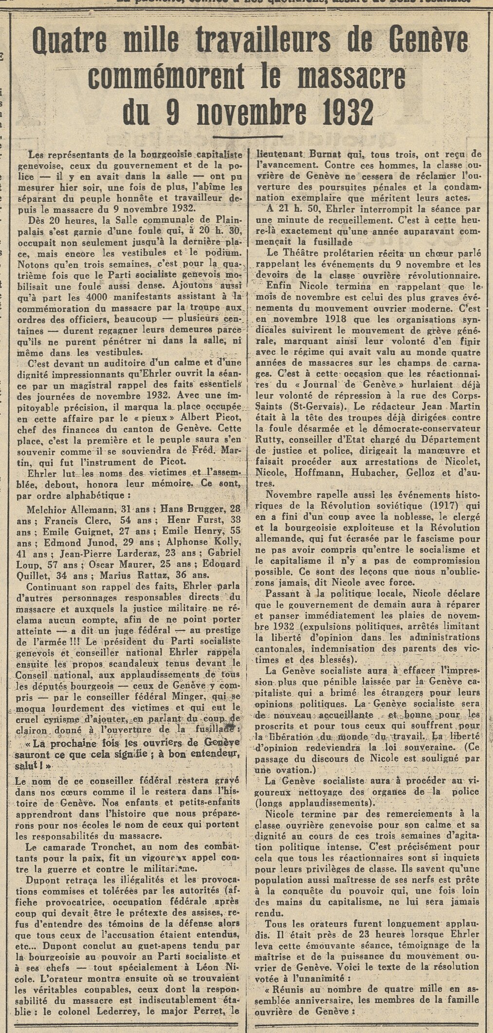 Dès 1933, le mouvement ouvrier genevois se mobilise pour rendre hommage aux victimes de la fusillade, organisant le 1er mai et le 9 novembre des manifestations unitaires associant ses divers courants. Ces commémorations auront régulièrement lieu dans les années 1930.